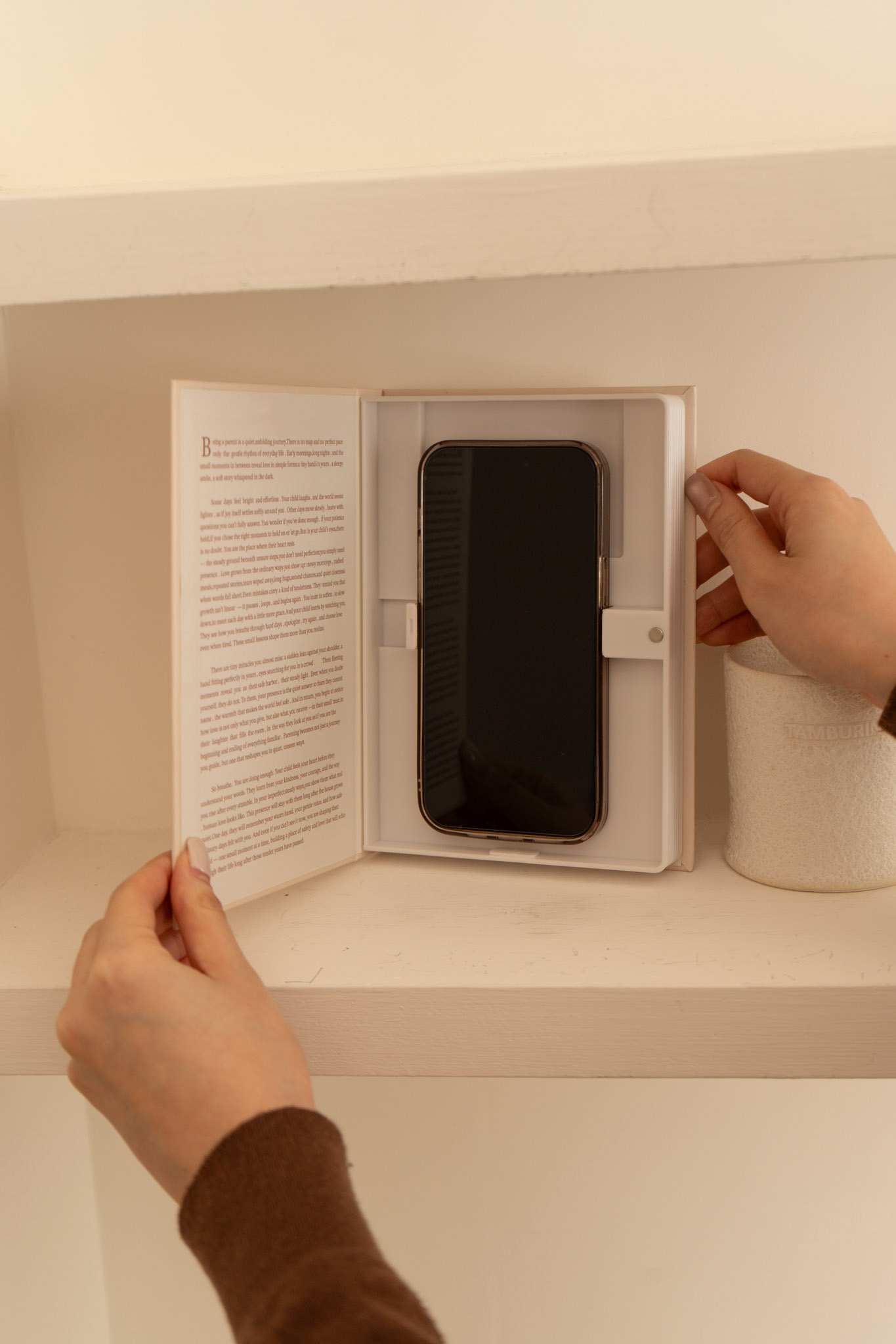 Little Secret 以書本造型設計,外觀低調優雅,靜靜佇立在書架或床邊毫不突兀,卻在翻開的瞬間,揭開令人會心一笑的巧思——原來手機,被好好收藏其中。這份「不說出口的驚喜」,正是最動人的送禮細節。