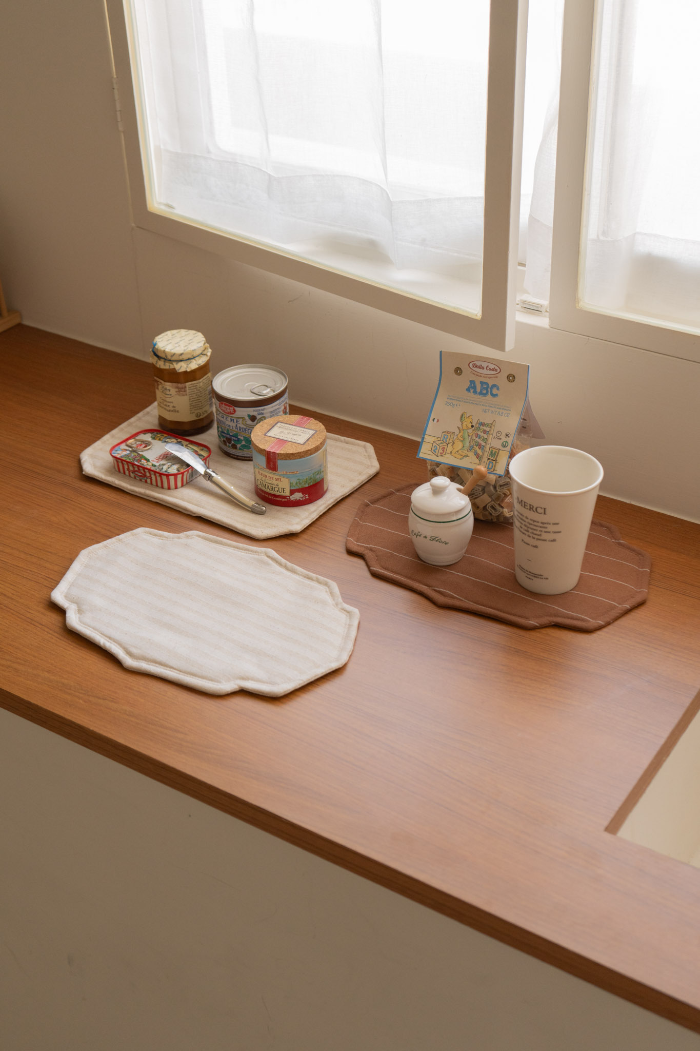 多邊形與長方形設計,搭配棉麻白與可可棕兩種色調,能依餐桌風格自由混搭,無論是用餐擺盤、隔熱墊、咖啡杯墊或小物置放,都能自然融入居家場景。布面紋理與細緻車縫細節,呈現樸實卻耐看的生活質感。
