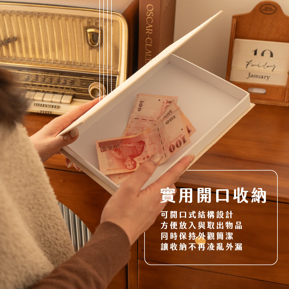 外觀看似一本靜靜佇立的書,翻開後,卻藏著生活中最需要被好好安放的小物。以書本造型為靈感,結合收納與裝飾功能,讓物件自然融入空間,不打擾視覺,也不顯雜亂。